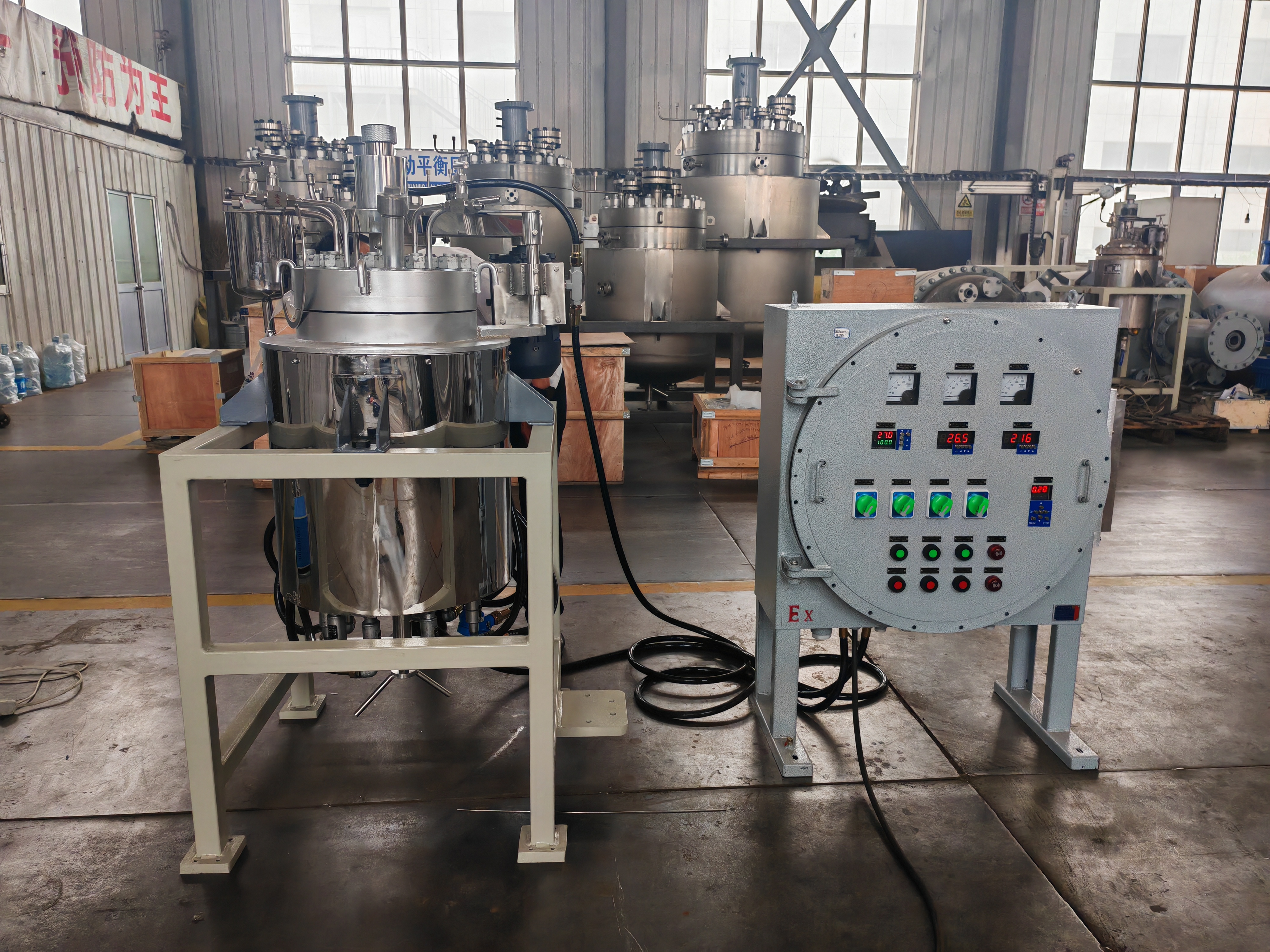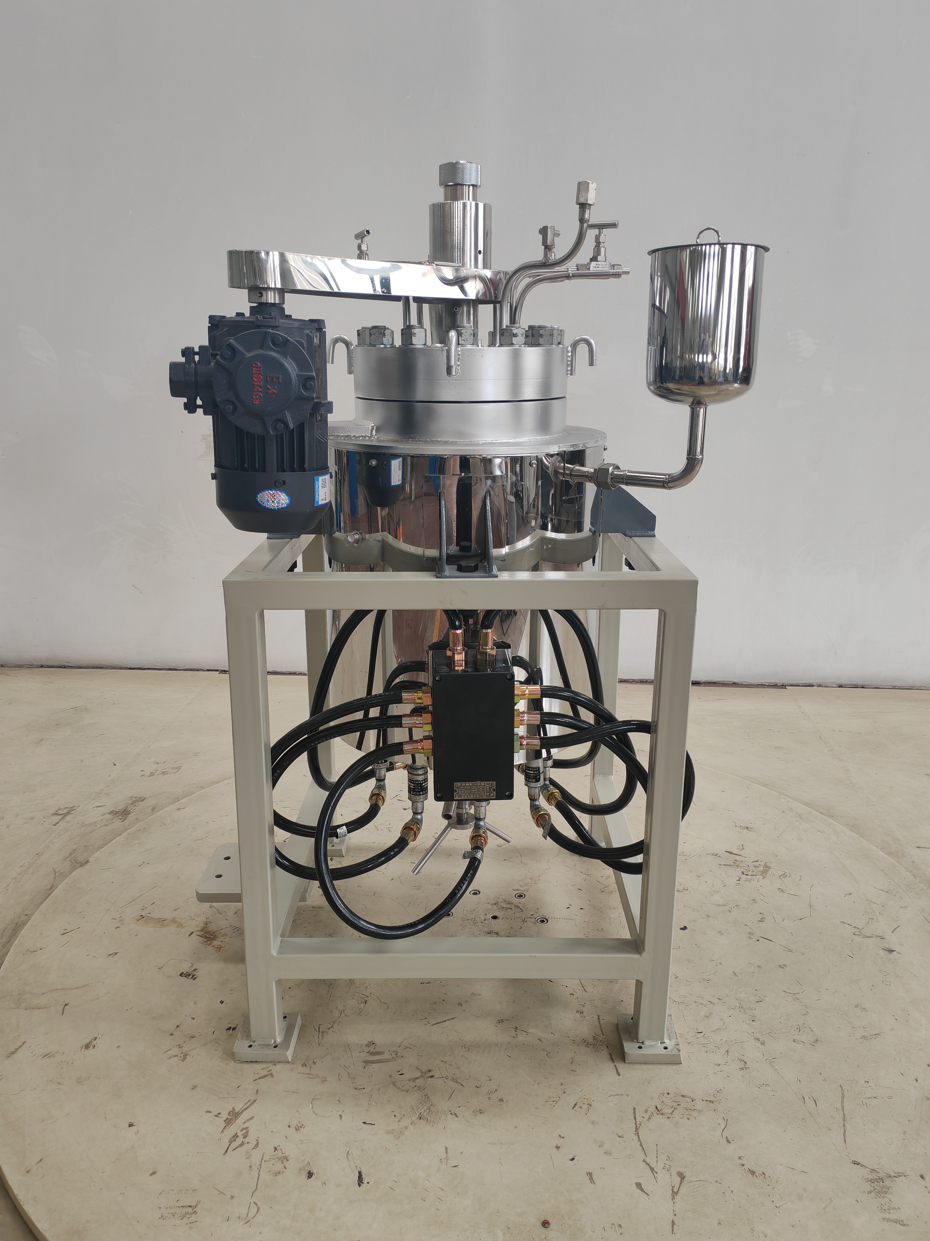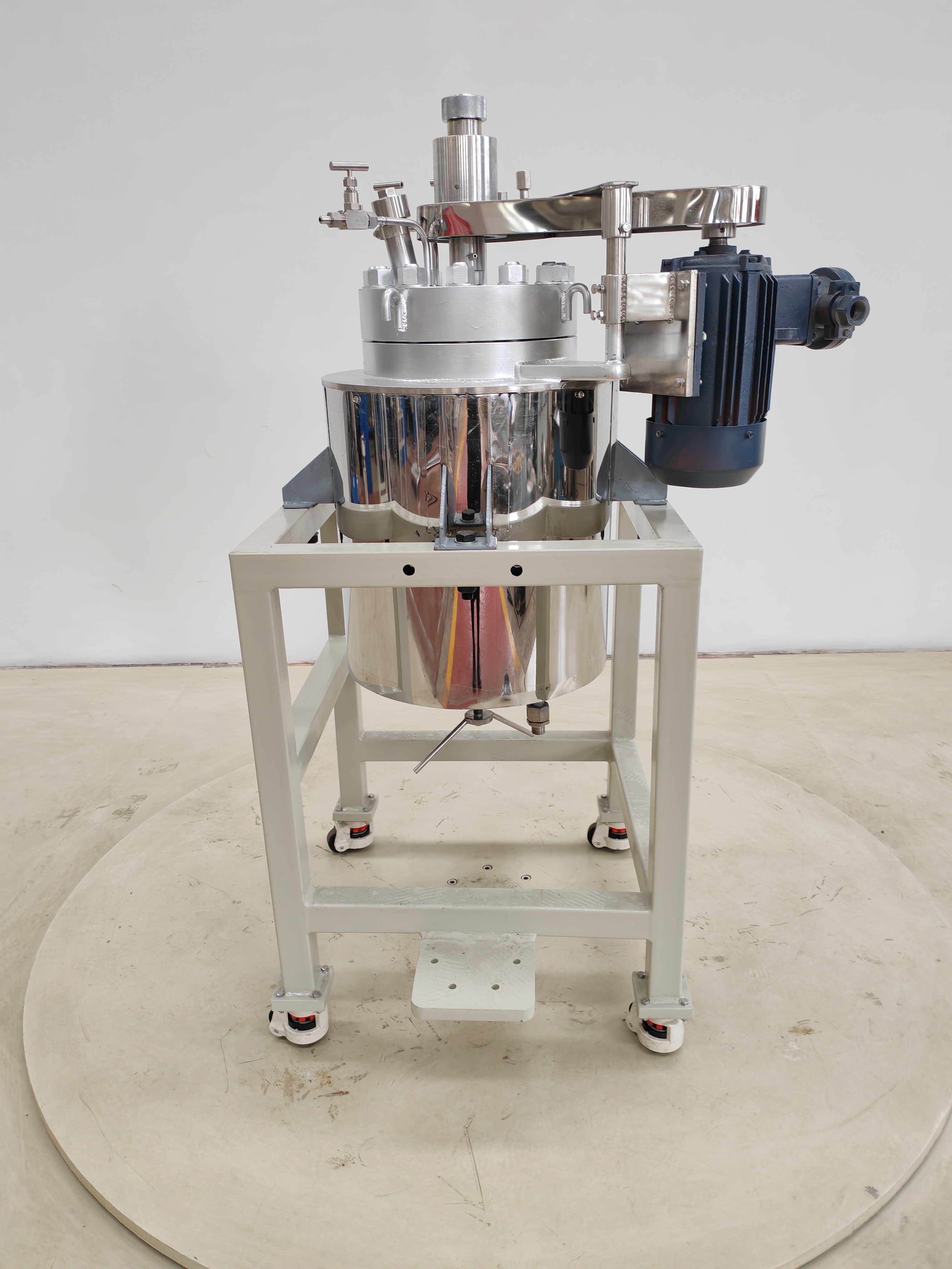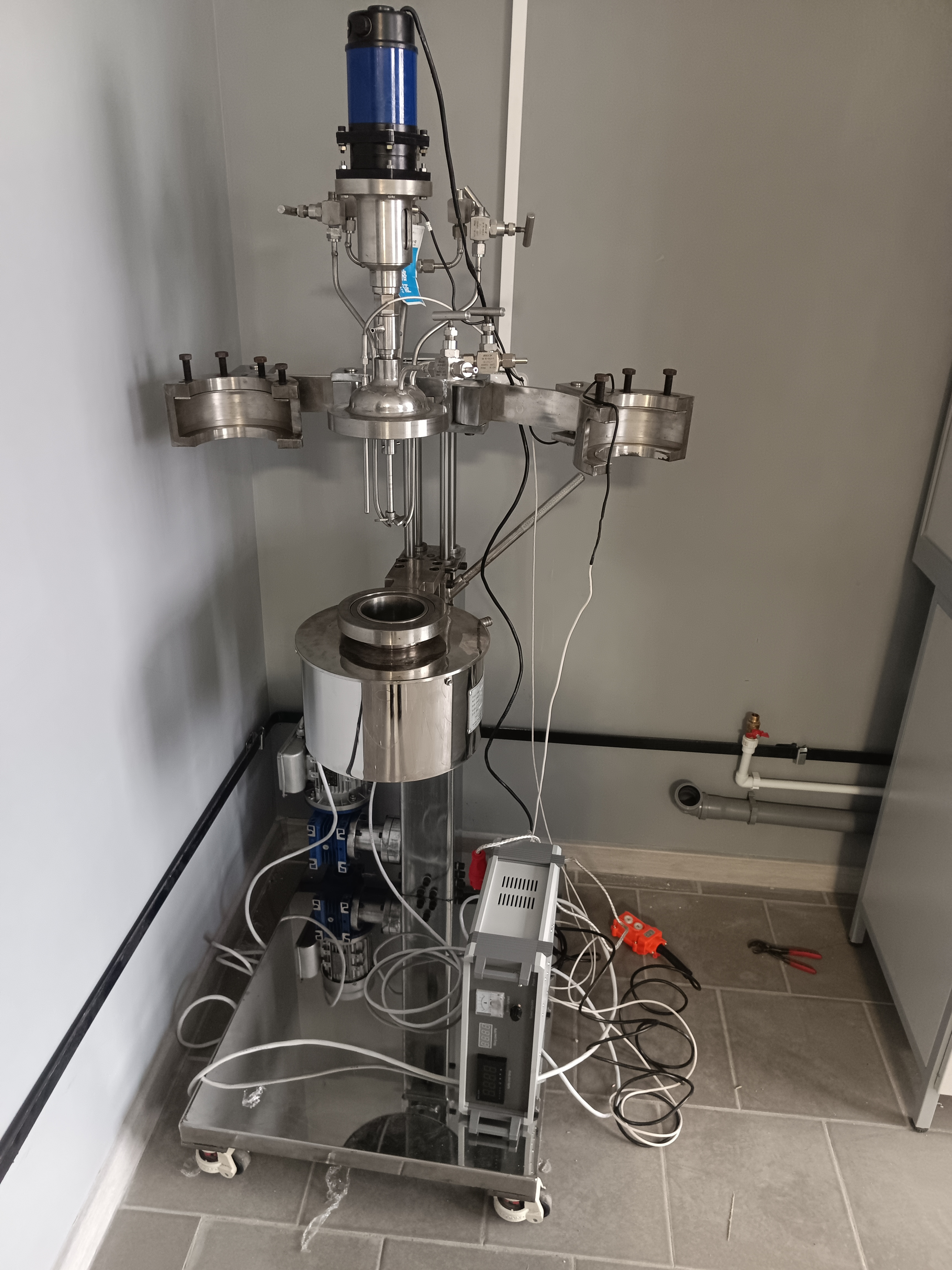 Depending on volume and configuration, units can be supplied as benchtop reactors (0.1–1 L) or floor-standing systems on mobile frames (5–50 L) with a separate electrical control cabinet.
